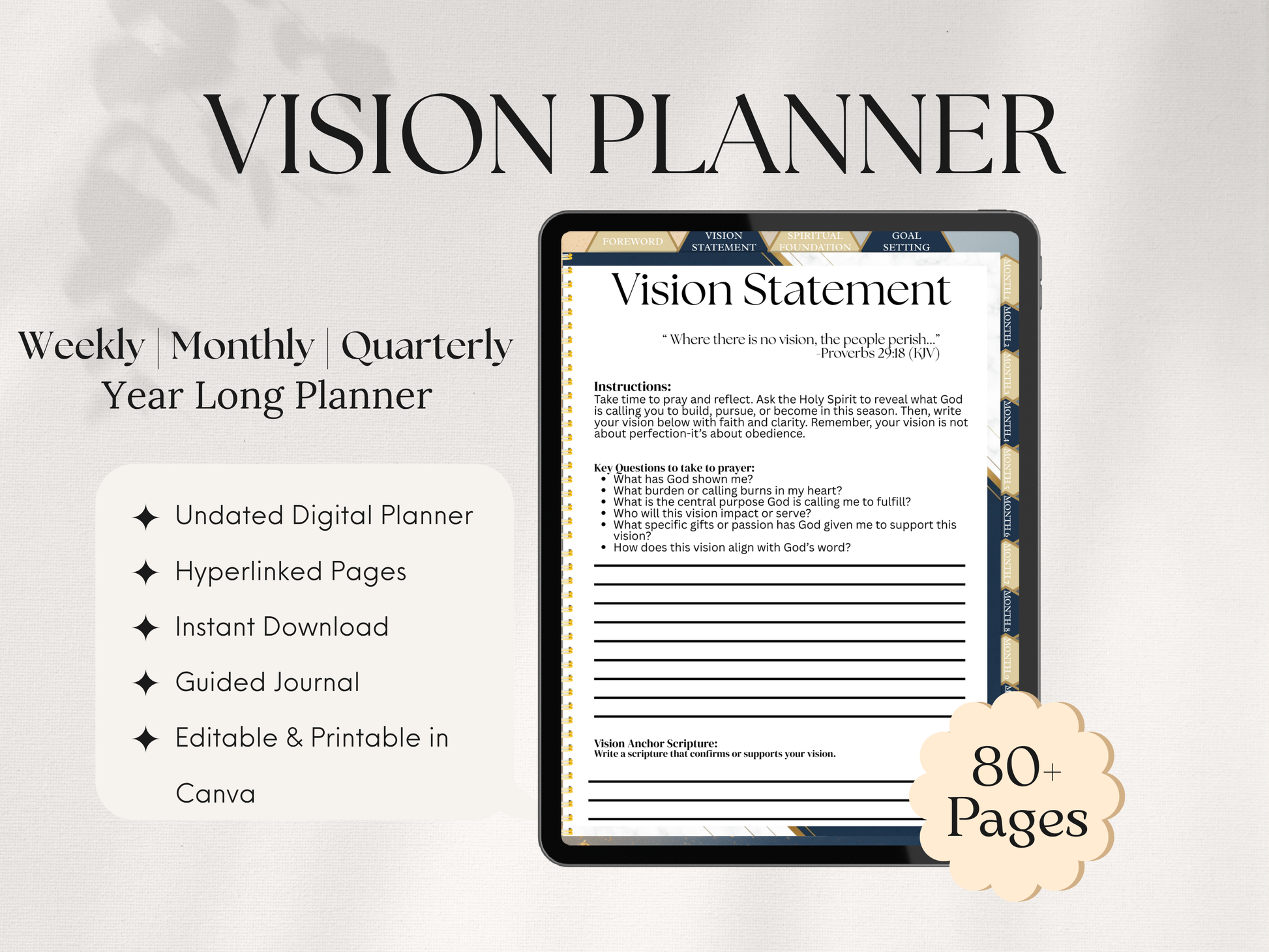 From Vision to Victory: Christian Digital Planner for God-Given Goals (Undated, Editable in Canva, 80+ Pages, Hyperlinked)